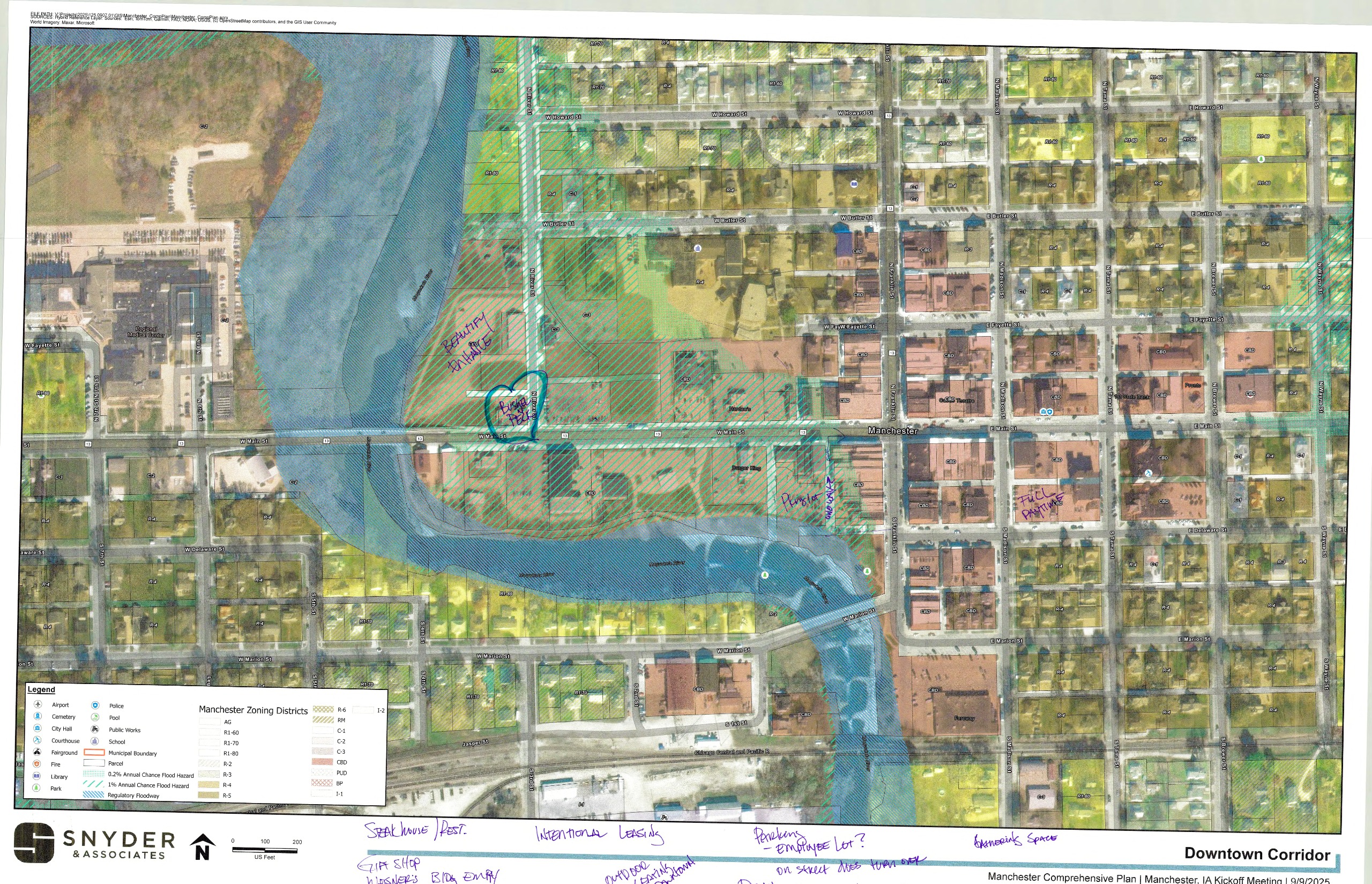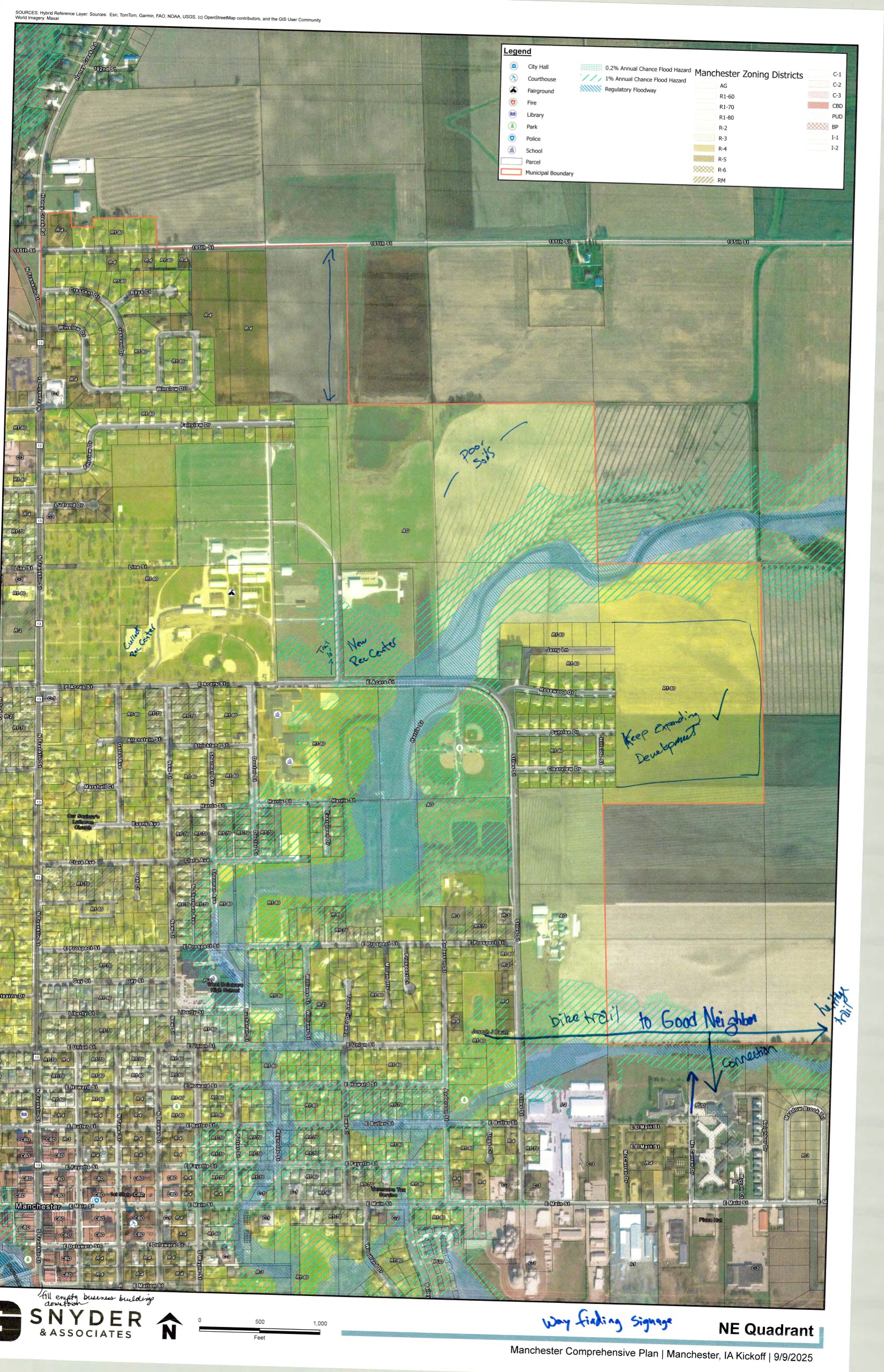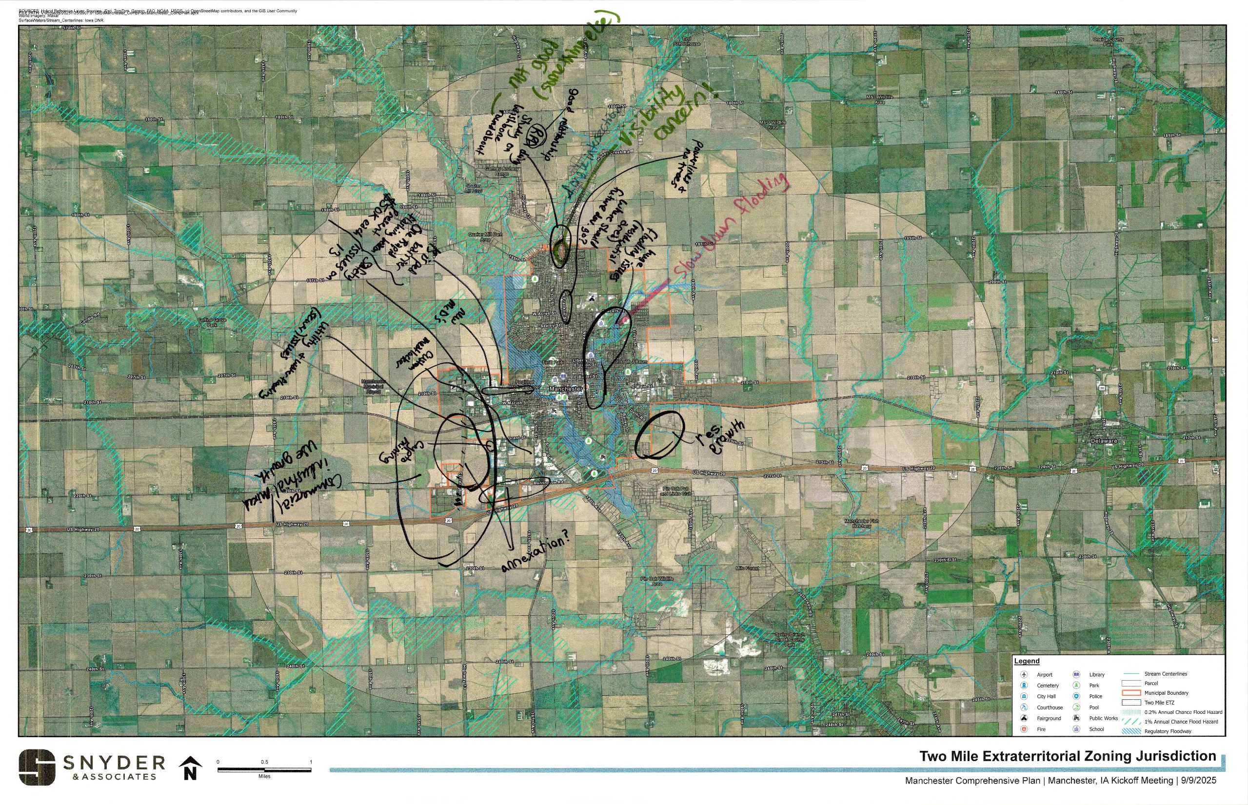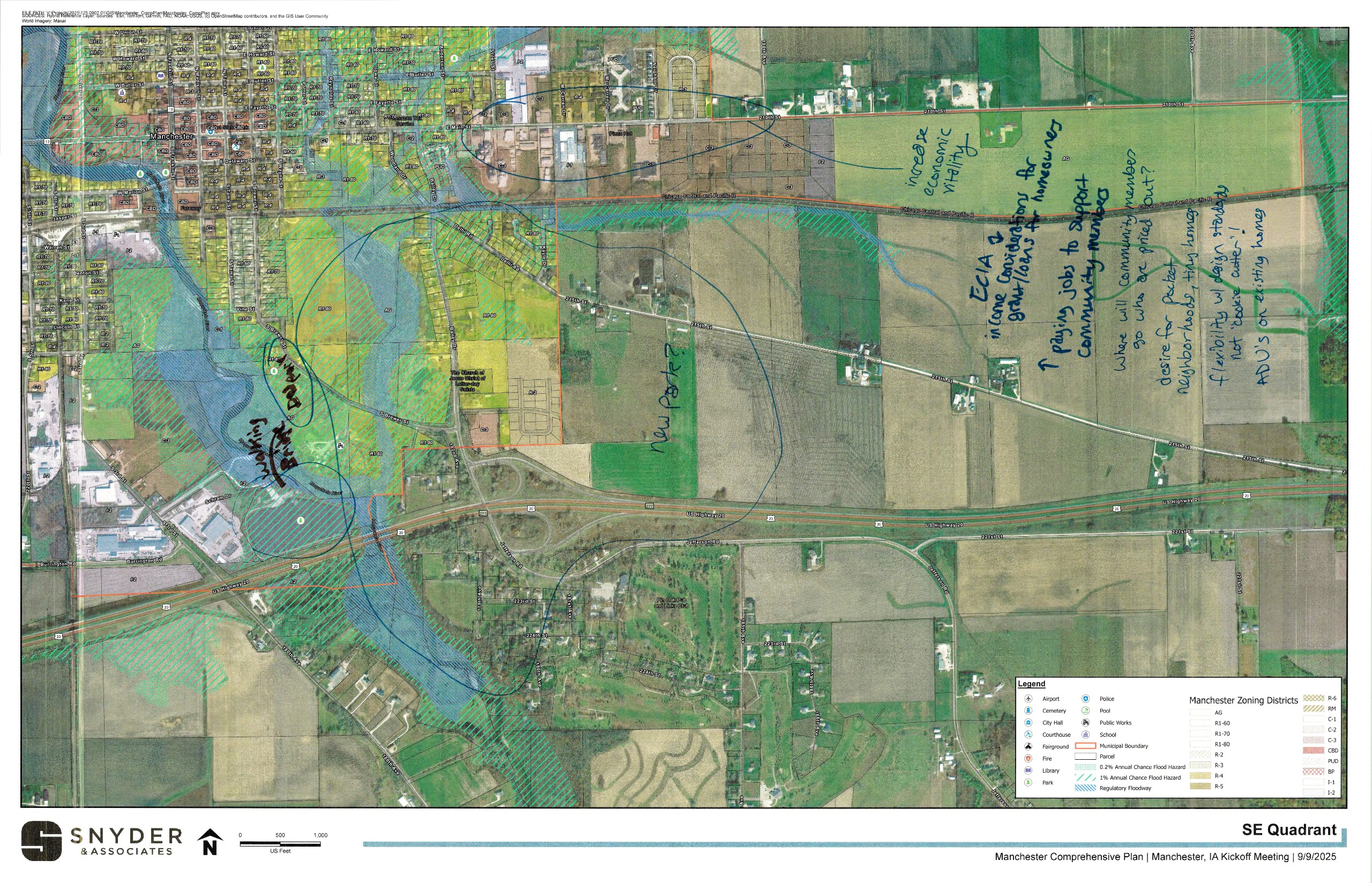 On September 11, 2025, the project team met with Planning & Zoning Commission members for an initial brainstorming workshop. Large maps of different parts of the City were provided with markers to make notes on the sheets, and participants were asked to focus on things they felt were either a challenge or an opportunity for the community. Everyone in attendance at the regularly scheduled meeting, including the public, was invited to participate. Afterwards, an overall "love or change" theme discussion was held to incorporate each member's top themes into a consolidated list. This discussion and the associated documents help the project team to understand better the existing conditions and the desires of the decision making body for the community. These are being used to develop preliminary comprehensive plan drafts and community engagement tools to be shared with the general public and specific interested parties in the coming months. Use the image gallery to scroll through the documents. Then, to view them larger or save a copy for yourself scroll down on a mobile device or look at the right hand sidebar on a desktop device for the "scanned notes" section where high resolution PDFs are saved of each document.