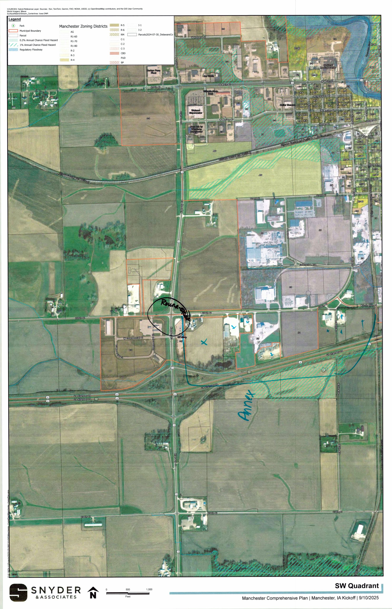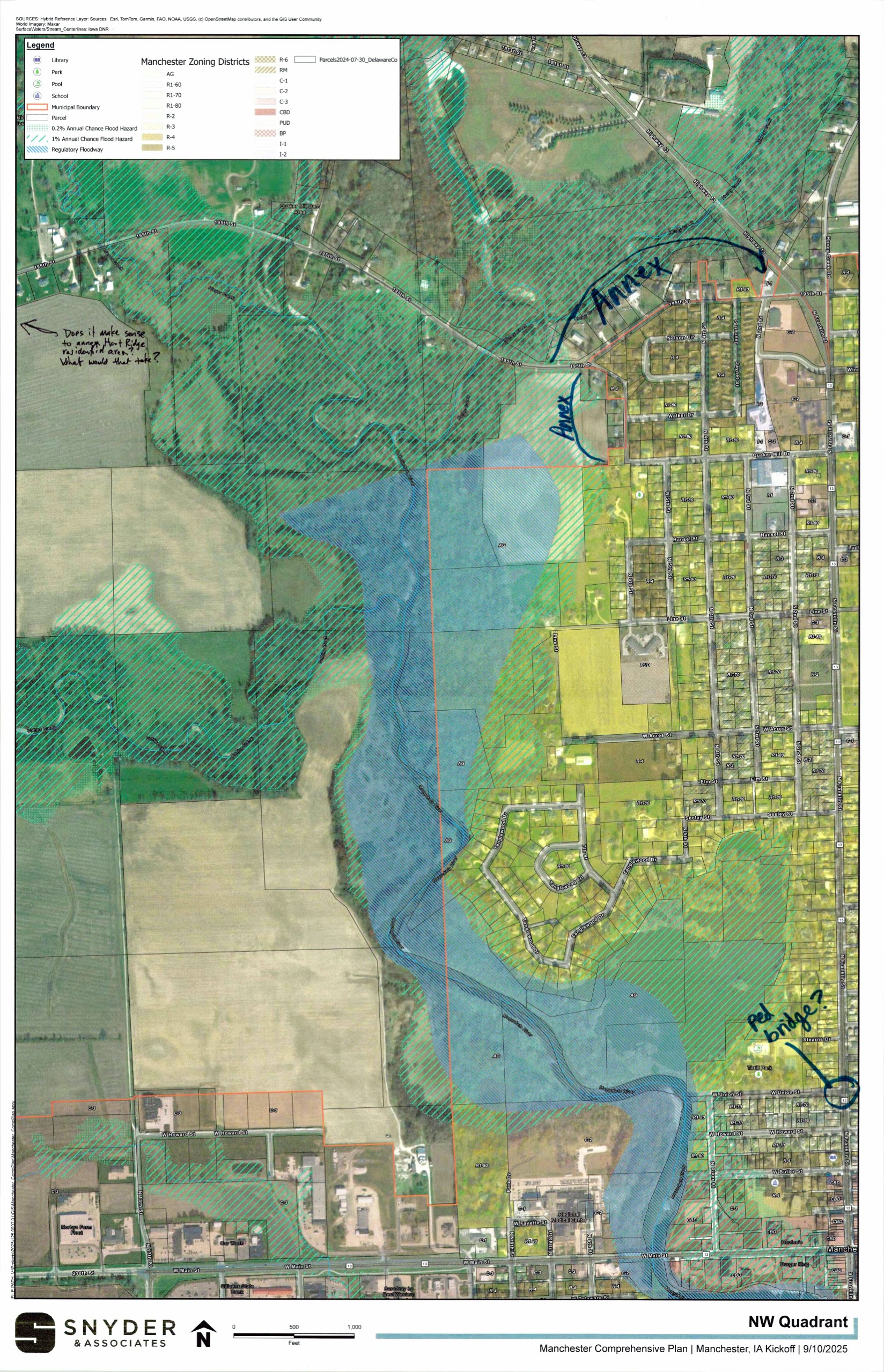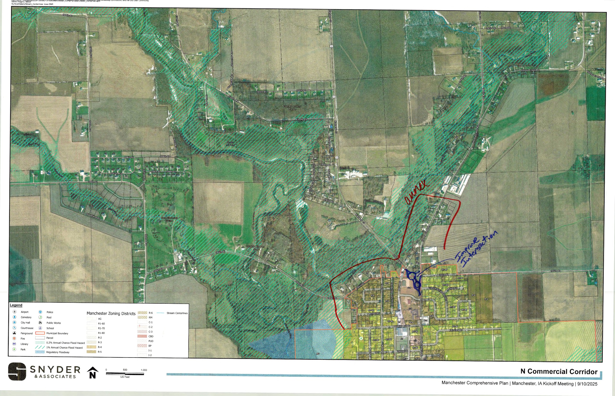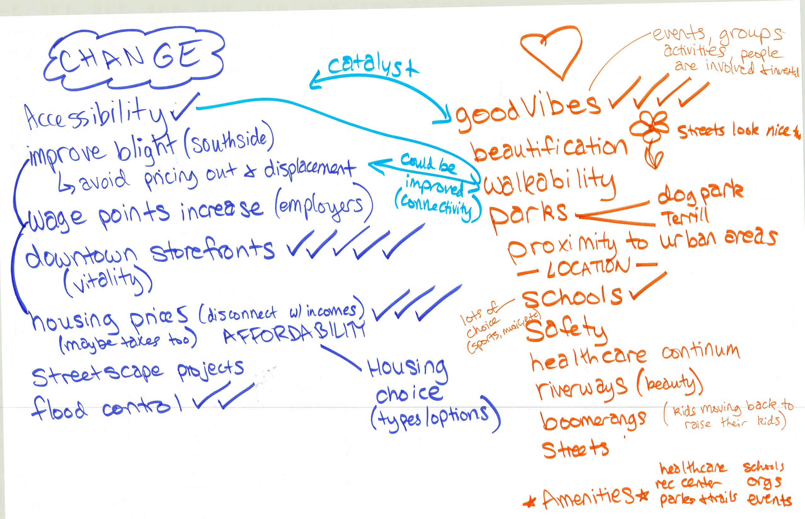 On September 11, 2025, the project team met with Planning & Zoning Commission members for an initial brainstorming workshop. Large maps of different parts of the City were provided with markers to make notes on the sheets, and participants were asked to focus on things they felt were either a challenge or an opportunity for the community. Everyone in attendance at the regularly scheduled meeting, including the public, was invited to participate. Afterwards, an overall "love or change" theme discussion was held to incorporate each member's top themes into a consolidated list. This discussion and the associated documents help the project team to understand better the existing conditions and the desires of the decision making body for the community. These are being used to develop preliminary comprehensive plan drafts and community engagement tools to be shared with the general public and specific interested parties in the coming months. Use the image gallery to scroll through the documents. Then, to view them larger or save a copy for yourself scroll down on a mobile device or look at the right hand sidebar on a desktop device for the "scanned notes" section where high resolution PDFs are saved of each document.